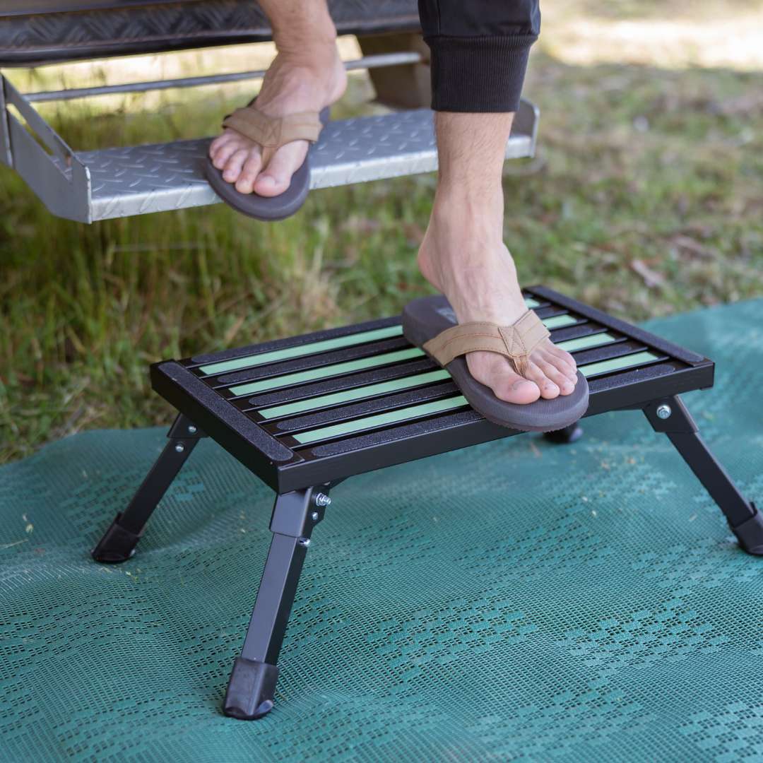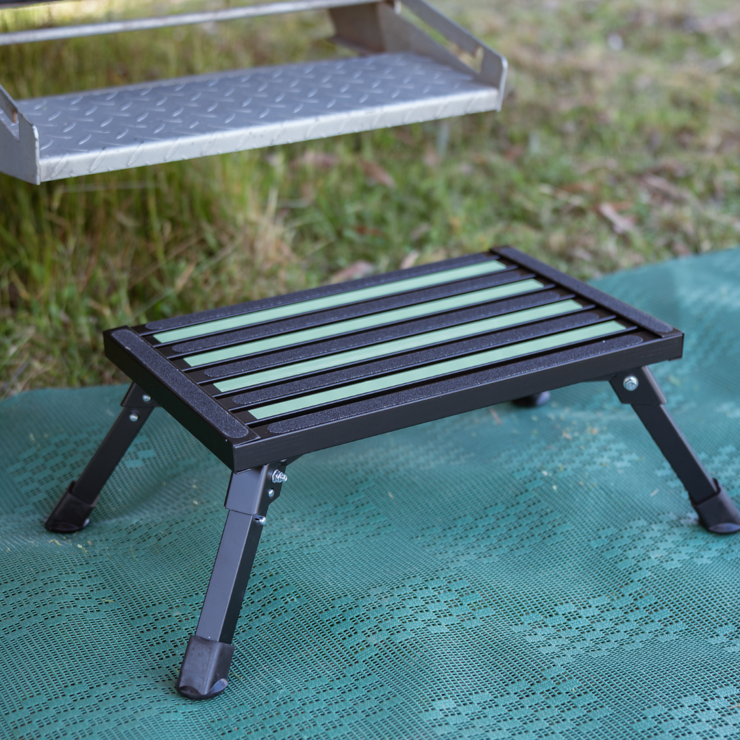 Black Caravan Step with folding legs, non-slip tread and luminous strip for safety. Lightweight, highly functional, multi-purpose step that will make entering and exiting your Caravan a breeze. The sleek modern design looks great with any caravan. Regardless of the surface or the weather this step will ensure that you will have a safe footing every time thanks to our non-slip tread and luminous strip for safety in the dark.