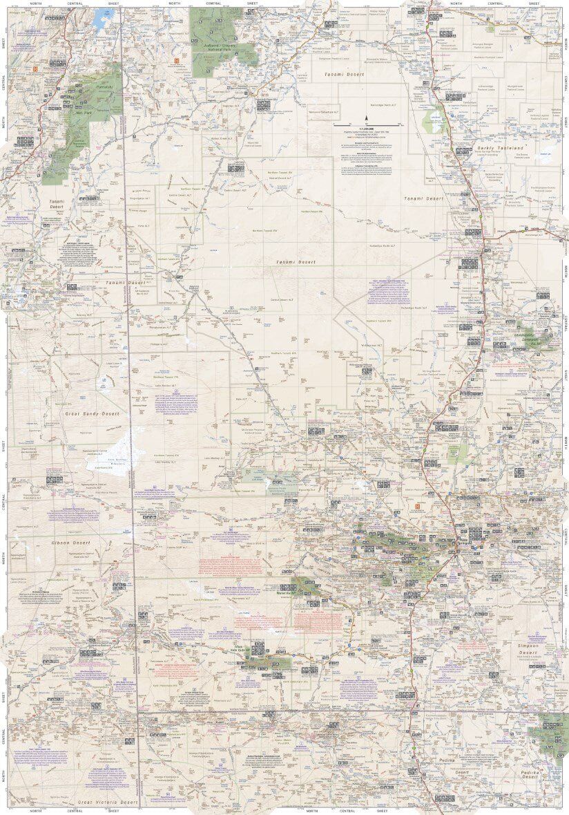 The Great Desert Tracks Central Sheet covers from Judbarra/Gregory National Park in the north to Ceduna in the south, and from Halls Creek in the west to Coober Pedy in the east. Marked on the mapping are roads and 4WD tracks checked by the Hema Map Patrol, distance markers, topographical relief and touring points of interest including 24-hour fuel, camping areas and caravan parks, facilities, services and more. Also included is information on travelling in the desert, what you need for the trip and relevant contact information.