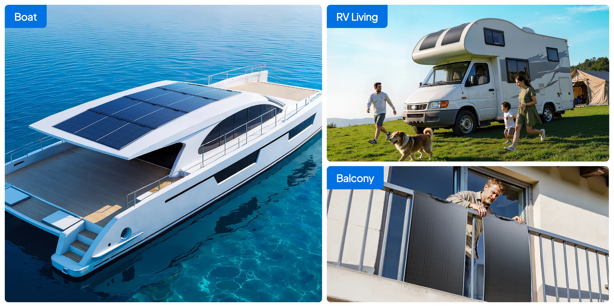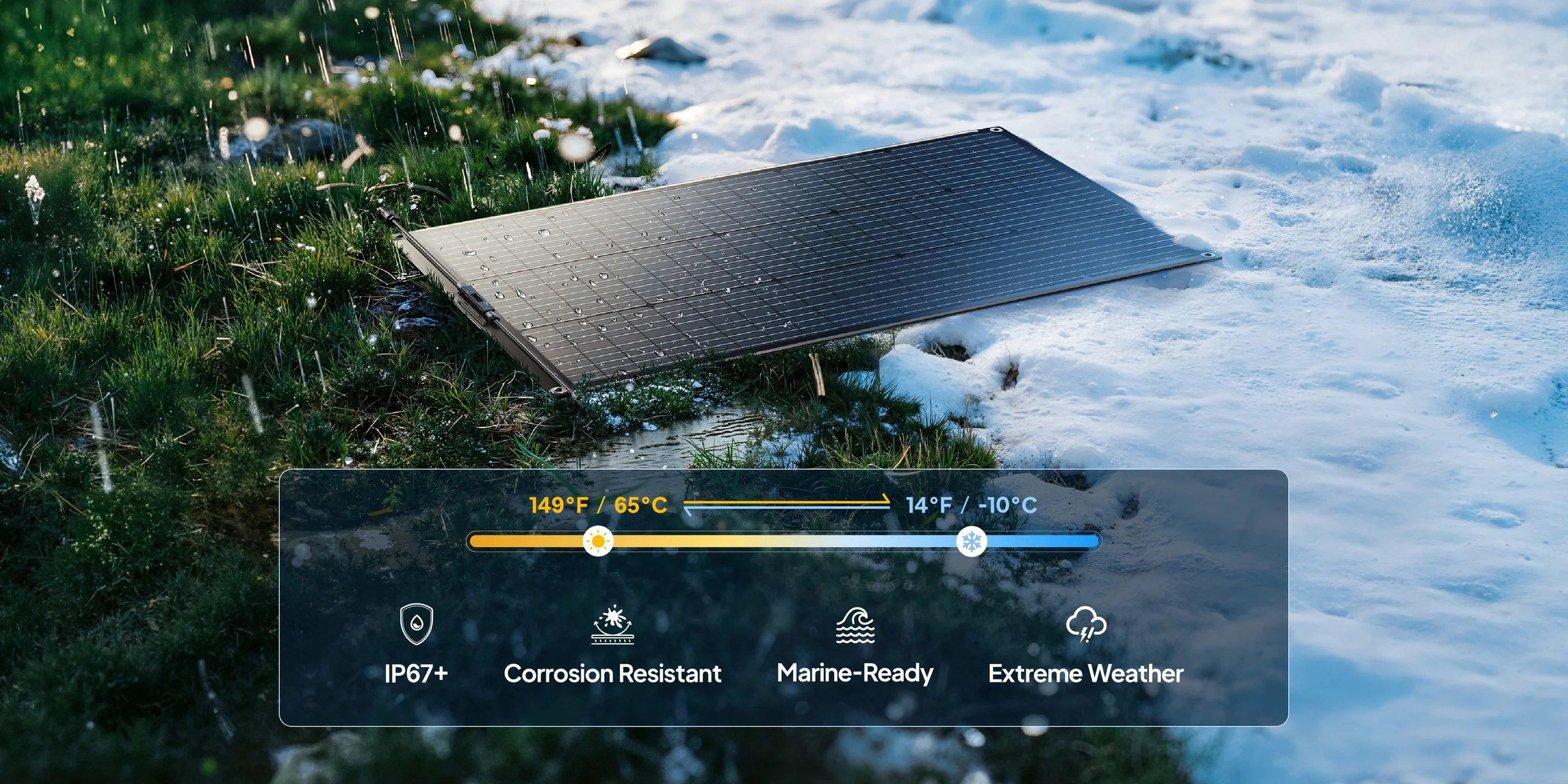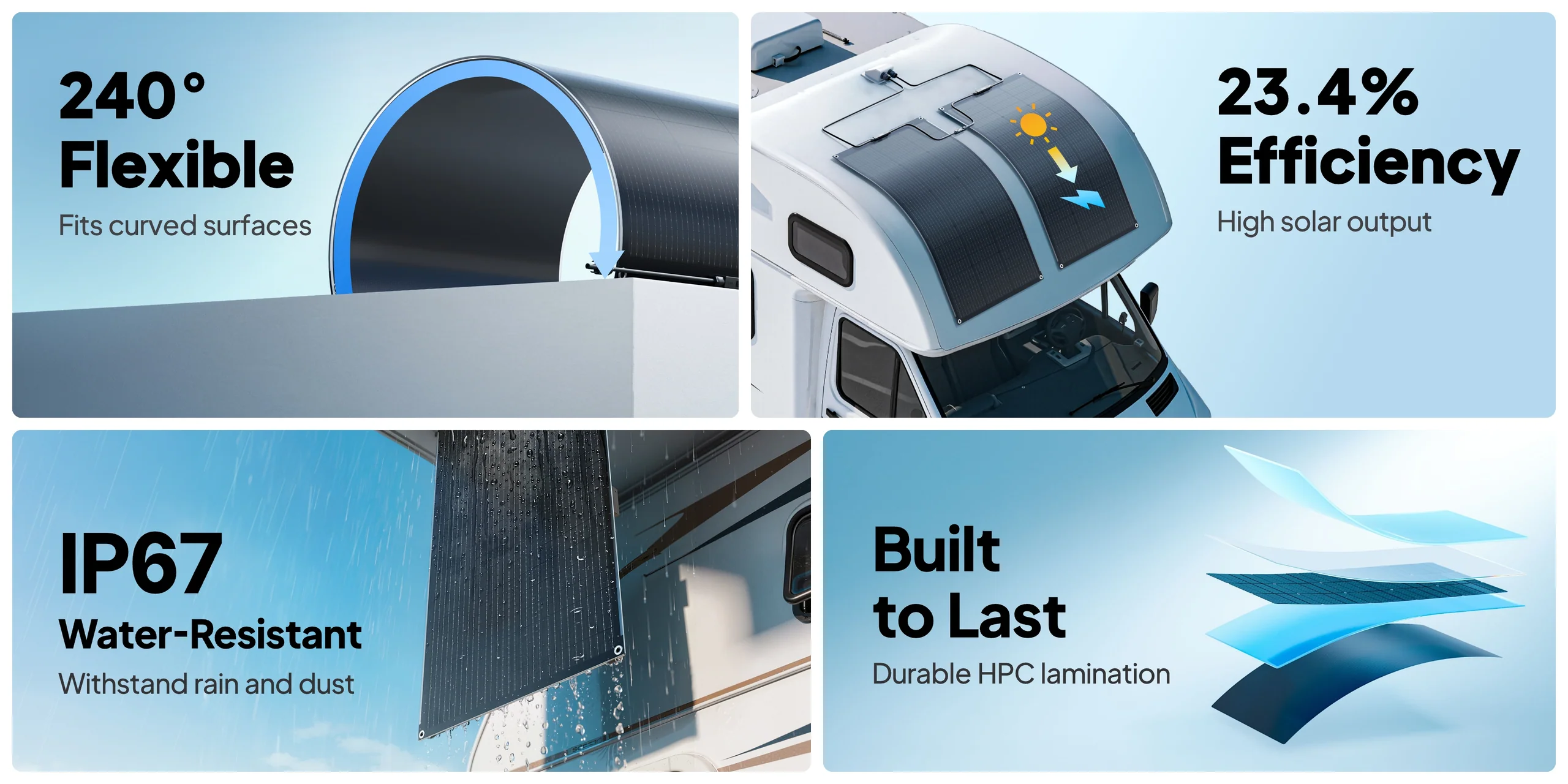 Flat roof? Curved surface? Uneven setup? No problem. The 240° bendable design adapts to your space, capturing maximum sunlight. With IP67 protection and an operating range of -25°C to 65°C, the PV100 FX performs reliably in nearly any environment.
